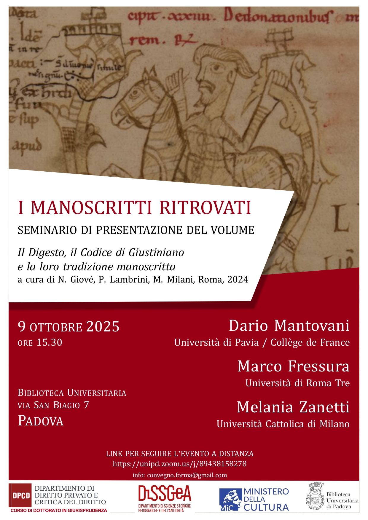Nell’occasione sarà presente anche la restauratrice, Prof.ssa Melania Zanetti che guiderà l’incontro insieme ai Professori Dario Mantovani e Marco Fressura: una bella occasione per dialogare con gli autori ma soprattutto per vedere i tre codici restaurati in tutto il loro splendore e per approfondire ogni curiosità in merito alle attività di tutela e recupero operate sui volumi.